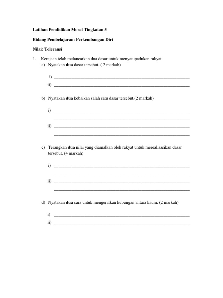 Ia dipecahkan kepada dua bahagian. Soalan Pertengahan Tahun Pendidikan Moral Tingkatan 1 adalah antara bahan-bahan terbaik yang kami adaBahan yang terdapat di sini memenuhi keperluan Pentaksiran Berasaskan Sekolah yang dilaksanakan secara menyeluruh mengikut prinsip bahawa semua mata pelajaran yang terkandung dalam KSSM memainkan peranan yang penting bagi memenuhi keperluan. SOALAN UJIAN MAC PENDIDIKAN MORAL TINGKATAN 2 1.