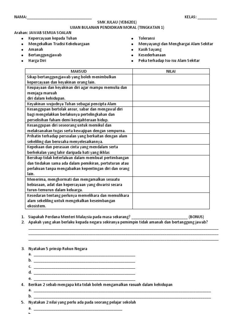 NAMA_____ TINGKATAN_____ SMK TAMAN KOTA KULAI UJIAN BULAN MAC 2016 PENDIDIKAN MORAL TINGKATAN 2 BAHAGIAN A Jawab semua soalan 25 soalan 1 Apakahsifatyangperluada pada seseorang yang berpegangkepadaajaranagama. Kertas 1 12251 merupakan ujian bertulis yang mencakupi semua bidang pembelajaran dari tingkatan 4 dan 5. Ujian Bulan Mac Pendidikan Moral Tahun 5 2018 adalah sebahagian kertas soalan yang telah berjaya dikumpulkan dan dikemaskini oleh GuruBesarmy.